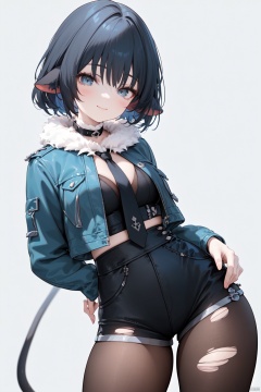 (score_9,score_8_up,score_7_up), (masterpiece),( beautiful),(high quality),(finely detailed),extremely detailed CG unity 8k wallpaper,best quality, 1girl, solo, small breasts, cleavage,looking at viewer, smile, short hair, bangs, simple background, shirt, black hair, thighhighs, long sleeves, white background, animal ears, closed mouth, green jacket, tail, pantyhose, cowboy shot, necktie, shorts, open jacket, grey eyes,book, fur trim, black shirt, thigh strap, black shorts, single thighhigh, arm behind back, asymmetrical legwear, fur collar, torn pantyhose, torn thighhighs, single leg pantyhose,jane
