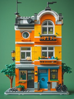 a lego building is displayed against a vibrant green backdrop. The building is made up of lego bricks
