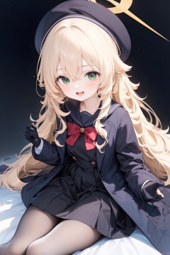 1girl, solo, long hair, looking at viewer, blush, smile, bangs, skirt, blonde hair, shirt, gloves, long sleeves, hat, bow, hair between eyes, school uniform, green eyes, jacket, pantyhose, pleated skirt, open clothes, serafuku, black gloves, bowtie, black skirt, sailor collar, off shoulder, red bow, black jacket, black pantyhose, black shirt, black headwear, beret, halo, thighband pantyhose,niyaBA, white_background