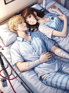 colorful, HEZI, Otome game, game promotional picture, intravenous drip, lying, blonde hair, 1girl, 1boy, bandages, looking at another, brown eyes, on back, hospital gown, blood bag, hospital bed, blue eyes, brown hair, hetero, long hair, striped, short hair, eye contact, blood, pillow, indoors, glass, on side, bandaged arm, shirt, vertical stripes, bed, syringe, bottle, black hair, on bed, short sleeves, string of fate, parted lips, smile, pants, pajamas, string, blurry, pill, striped pants, cup<lora:乙女风格游戏模型-000019:0.5>,