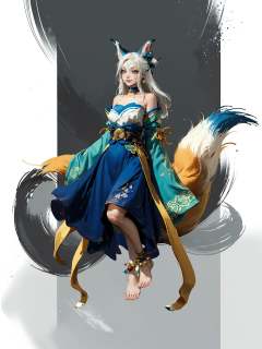 costume,HEZI,Chinese style,character design,game style,1girl,solo,long hair,barefoot,anklet,bell,dress,butterfly,white hair,hair ornament,bare shoulders,bug,flower,full body,white background,animal ears,blue eyes,jewelry,blue dress,fox ears,looking at viewer,simple background,floating,facial mark,tail,smile,ahri \(league of legends\),bangs,detached sleeves,jingle bell,orb,bare legs,fox tail,makeup,breasts,wide sleeves,very long hair,choker,hair bell,closed mouth,hair bun,petals,ribbon,lotus,blue flower,whisker markings,blue butterfly,white dress,<lora:黑悟空人物设计-000011:0.7>,