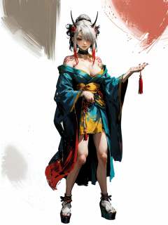 costume, HEZI, Chinese style, character design, game style, 1girl, solo, japanese clothes, floating, horns, kimono, black hair, white background, hair ornament, flower, red eyes, hair flower, simple background, high heels, multicolored hair, bare shoulders, looking at viewer, full body, mirror, breasts, smile, black footwear, tattoo, floating object, off shoulder, wide sleeves, bangs, choker, leg tattoo, hair over one eye, crescent, hair stick, hair bun, white hair, animal ears, cleavage, long sleeves, standing, platform footwear, tassel, streaked hair, parted lips, sidelocks, large breasts, oni horns, closed mouth, purple kimono, socks, side slit, black choker, two-tone hair, dress, red flower, levitation, oni, gradient clothes,<lora:黑悟空人物设计-000011:0.7>,