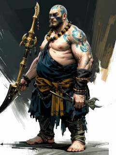 HEZI, game character, 2D, Black Myth Goku character, dark style, solo, 1boy, male focus, holding, weapon, necklace, pectorals, holding weapon, facial hair, bald, muscular male, tattoo, beads, muscular, holding axe, jewelry, axe, full body, looking at viewer, bead necklace, arm tattoo, beard, bare pectorals, standing, scar on face, mature male, scar, short hair, prayer beads, nipples, black hair, large pectorals, shoulder tattoo, toenails, bara, scar on forehead, torn clothes, barefoot, veins, holding polearm, white background, chest hair, fat, holding staff, fat man, staff, simple background, abs, black pants, pants<lora:黑悟空人物设计-000011:0.7>,