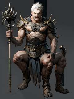 HEZI, game character, 2D, Black Myth Goku character, dark style, 1boy, male focus, solo, holding, staff, holding staff, open mouth, sitting, white hair, glowing, full body, weapon, teeth, polearm, taur, muscular, looking at viewer, glowing eyes, armor, veins, spiked hair, smile, holding weapon, colored skin, simple background,<lora:黑悟空人物设计-000011:0.7>,