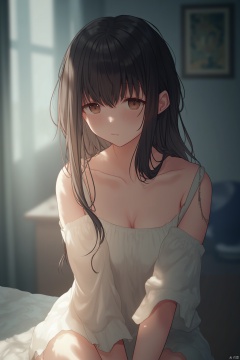 XS,masterpiece:1.2),best quality,high resolution,unity 8k wallpaper,(illustration:1),perfect lighting,extremely detailed CG,finely detail,extremely detailed,soft lighting and shadow,soft yet striking lighting,film grain:1.2,(skin pores:1.2),(detailed skin texture:1),((solo:1.5)),Detailed face,(see-through:1.1),misty,Low Key:1.1,depth of field,A young woman in a white dress,sitting on her bed with contemplative expression.,