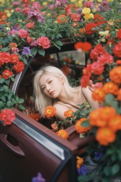 A young girl with striking white hair lounges lazily in a car filled to the brim with vibrant, colorful flowers - a riot of red, yellow, orange, purple, and blue blooms bursting forth from every nook and cranny. The interior shot is taken from within the car, where the soft, dreamy lo-fi light wraps around her, accentuating her youthful energy and cool expression. Her white hair shines like a beacon amidst the sea of petals, as if infused with an otherworldly essence. Flowers sprout from every surface, creating a whimsical, surreal atmosphere reminiscent of Rinko Kawauchi's art style. The Sigma Art Lens 35mm F1.4 and Canon EOS camera capture the intricate details with stunning clarity, rendering the scene in breathtaking high definition.