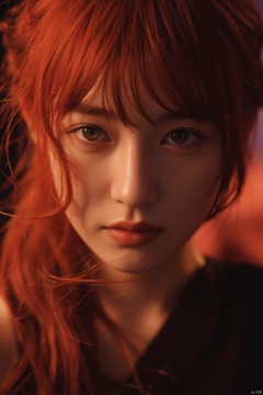 Create an ultra-realistic, photorealistic image of a stunning anime portrait of a red-haired girl with intense yellow eyes, showcasing intricate hand details and braided hair. Capture her in a close-up view, dressed in dark clothing with strong light and shadow contrasts accentuating her features. Her 17-year-old face should be rendered with perfect skin texture, realistic pores, and subtle facial expressions. The background should be equally detailed, with vibrant colors and dynamic particles swirling around her, as if taken by a Sony Alpha 7R IV camera with a Zeiss Otus 85mm F1.4 lens, ISO 100, shutter speed 1/400, resulting in a vivid picture with an analog feel.