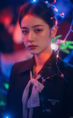 A stunning masterpiece! In a studio setting, a 21-year-old woman dressed in a Prada school uniform and elegant makeup with pink eyeshadow gazes directly at the viewer. Her gaze is enhanced by subtle side lighting, creating a sense of depth and dimensionality. The background is simple yet effective, allowing the subject to take center stage. The atmosphere is electric, with vibrant and colorful LED lights surrounding her, evoking the excitement of a nightclub setting. The wide-angle lens captures a dynamic composition, featuring detailed textures and a classy aesthetic that exudes confidence and sophistication, as if she's ready to hit the dance floor.