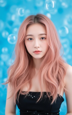 a young Asian woman with long, wavy, light pink hair stands in front of a blue backdrop. Her hair cascades over her shoulders, adding a touch of contrast to her face. She is dressed in a black dress adorned with gold accents, adorned with tiny silver circles. Her eyes are a piercing blue, her eyebrows are a darker shade of brown, and her lips are a lighter shade of pink. The woman's hair is cascading down her left shoulder, framing her right shoulder. The backdrop is made up of a series of bubbles, adding depth to the composition.
