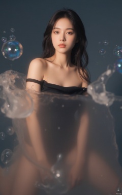 (ultra realistic,best quality),photorealistic portrait of 26yo hubggirl,She is stylish and glamorous with her long hair and delicate features,surrounded by surreal floating water bubbles,splash detailed,surreal dramatic lighting shadow (lofi, analog),kodak film,moment eyes,beautiful face,sexy girl,full_body,