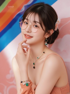 Portrait of a 21-year-old hubggirl, solo and direct at the viewer with a warm smile. She wears an ensemble of luxurious gold-trim jewelry, including long earrings and a bow hair ornament. A stunning Agate necklace and Emerald bracelet adorn her neck and wrist, respectively, while Diamonds and Onyx add subtle sparkle. Her eyes are framed by Wangyushan's signature eyeglasses. Set against a backdrop of vibrant colors, the scene is bathed in bright natural light, showcasing every detail with high contrast HDR photography.