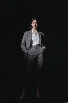 A captivating 35mm photograph of a 20-year-old hubggirl exudes confidence and elegance as she looks directly at the viewer with clear facial contours illuminated by dramatic, dark, moody lighting that accentuates voluminous shadows. She wears smart-casual attire, featuring a blouse, tailored pants, loafers, and a relaxed blazer, or perhaps a midi dress, all captured in high definition using an 8K Hasselblad camera with the iconic 50mm f/1.9 lens, showcasing the subject's beauty in stunning detail.
