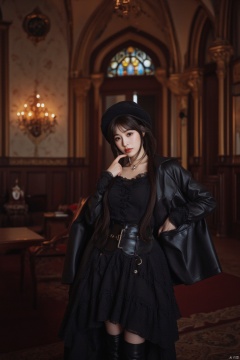 In a grand, luxurious medieval palace interior, a mesmerizing, mature curvy gothic woman stands confidently, her long hair tied in a sleek, high ponytail. She gazes directly at the viewer with an air of mystery and enchantment. Her pale skin glistens with subsurface scattering, while her dark, rich hair cascades down her back like a waterfall. She wears a stunning outfit that blends Victorian and Gothic Lolita styles, featuring black lace gloves, an aristocratic hat, leather knee boots, and a ruffled blouse layered under a dramatic, Gothic-inspired skirt. The overall effect is one of opulence and extravagance, with intricate details and patterns adorning her clothes and the palace's antique furniture, stained glass windows, and gothic wallpaper. In the background, chandeliers cast warm, cinematic lighting, while victorian wall lamps add a touch of elegance to the scene. A leather coat with prominent buckles hangs artfully over her shoulder, adding a touch of gothpunk flair. The atmosphere is solemn, with a focus on antique bronze tones and a sense of dark fairytale fantasy. The overall image exudes photorealistic quality, with attention paid to every detail, from the subject's skin texture to the intricate patterns on her clothes.