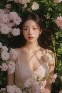 In a photorealistic portrait, Hubggirl reclines amidst lush flowers, her porcelain skin glowing in the serene ambiance. Delicate features and intricate Chinese patterns on her forehead exude mystique. Soft breasts and defined collarbone convey vulnerability, as luminous lighting casts a dramatic rim around her face. The camera captures every detail, from soft nature lights to captivating coloration, with an ultra-realistic tone.