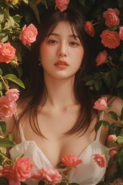 In a photorealistic portrait, Hubggirl reclines amidst lush flowers, her porcelain skin glowing in the serene ambiance. Delicate features and intricate Chinese patterns on her forehead exude mystique. Soft breasts and defined collarbone convey vulnerability, as luminous lighting casts a dramatic rim around her face. The camera captures every detail, from soft nature lights to captivating coloration, with an ultra-realistic tone.