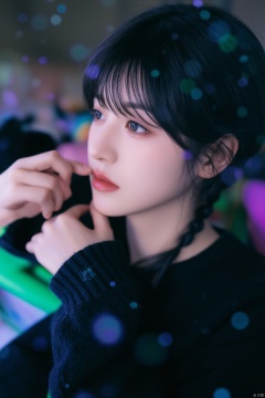 Create an ultra-realistic, photorealistic image of a stunning hubggirl portrait of a green and blue-haired girl with intense purple eyes, showcasing intricate hand details and braided hair. Capture her in a close-up view, dressed in dark clothing with strong light and shadow contrasts accentuating her features. Her 21-year-old face should be rendered with perfect skin texture, realistic pores, and subtle facial expressions. The background should be equally detailed, with vibrant colors and dynamic particles swirling around her, as if taken by a Sony Alpha 7R IV camera with a Zeiss Otus 85mm F1.4 lens, ISO 100, shutter speed 1/400, resulting in a vivid picture with an analog feel.