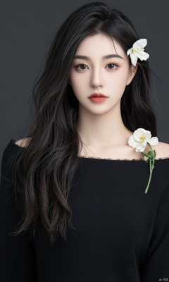 1girl, solo, long hair, looking at viewer, simple background, black hair, upper body, flower, parted lips, hair over one eye, black eyes, lips, white flower, black background, one eye covered, realistic, red lips