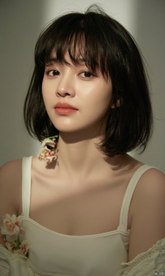 A mature Asian woman with a bun head,solo, looking at viewer, short hair, black hair, bare shoulders, brown eyes, closed mouth, collarbone, upper body, flower, black eyes, lips, shadow, realistic, very short hair
