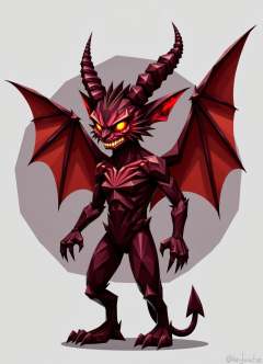 sfw,digital illustration, geometric, polygons , imp, small, mischievous supernatural humanoid creature, impish features, horns, pointed ears, sharp teeth, bat like leathery wings, fiery glowing eyes, clawed hands and feet, tail, red to dark shaded skin, trickster, servant of a higher power, prone