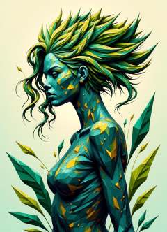 sfw,digital illustration, geometric, polygons ,  female voidcaller  Mastering conjuration shaped like Swirl of pigmented liquid plant and plant manipulation (controlling plant life)