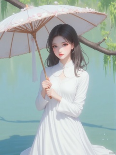 plhalfmask, A woman is standing in front of water. She is wearing a white dress and holding an umbrella. The umbrella is open and has flowers on it. There is a tree behind the woman.