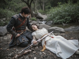 AKJK, A man in a costume,Kneeling on the ground, a woman, eyes closed, lying on the ground, a sword in her chest, blood on the ground