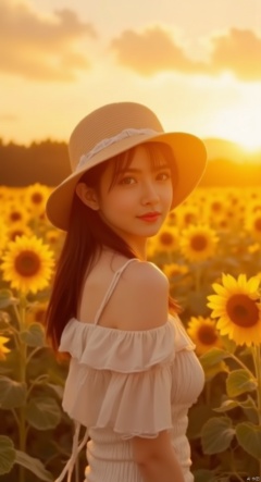 ,wangyushan,((Girl in straw hat looking back in a field of sunflowers)), (backlight), (best illumination, best shadow, an extremely delicate and beautiful), Girl on the center axis of the picture, small breasts, ((Sunflowers with the ultimate in detail)), beautiful detailed sky, Perfect body, (beautiful detailed face), extremely delicate and beautiful girls, Sunflower fields at sunset, sunset, black hair, beautiful detailed cloud, (((extremely detailed CG unity 8k wallpaper, masterpiece, best quality, ultra-detailed))), dynamic angle, floating, finely detail, (bloom), (shine), glinting stars, feather,nature,(sunlight), fairyland, (((The character is in the center of the frame)))