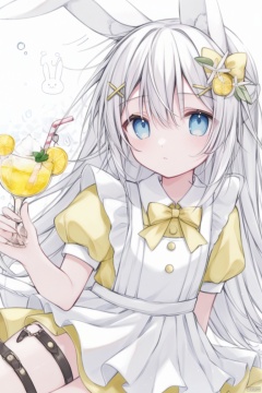1girl, solo, long hair, looking at viewer, bangs, blue eyes, hair ornament, dress, bow, holding, animal ears, hair between eyes, sitting, closed mouth, white hair, short sleeves, hair bow, food, hairclip, puffy sleeves, rabbit ears, apron, cup, puffy short sleeves, animal ear fluff, thigh strap, fruit, animal, x hair ornament, white apron, yellow bow, drinking glass, frilled apron, rabbit, collared dress, yellow dress, lemon, lemon slice