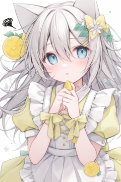 1girl, solo, long hair, looking at viewer, blush, bangs, blue eyes, simple background, hair ornament, white background, dress, bow, holding, animal ears, hair between eyes, flower, white hair, short sleeves, hair bow, grey hair, parted lips, food, hairclip, puffy sleeves, hair flower, apron, puffy short sleeves, hands up, fruit, flying sweatdrops, white flower, white apron, yellow bow, yellow dress, squiggle, lemon