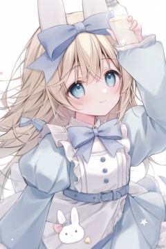 1girl, solo, long hair, blush, smile, bangs, blue eyes, blonde hair, long sleeves, white background, dress, bow, holding, animal ears, hair between eyes, closed mouth, flower, hair bow, heart, frills, puffy sleeves, rabbit ears, apron, arm up, sleeves past wrists, blue dress, blue bow, bottle, white apron, alice \(alice in wonderland\)