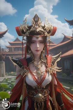 1girl, solo, breasts, looking at viewer, brown hair, black hair, hair ornament, dress, cleavage, jewelry, big breasts, upper body, earrings, parted lips, chinese clothes,Xdajisi,(Lotus, lotus pond, ancient Chinese architecture, blue sky and white clouds:1.29),Xjinpinger,Xluxueqi,XAerith,Xtifa,Xyuanyao