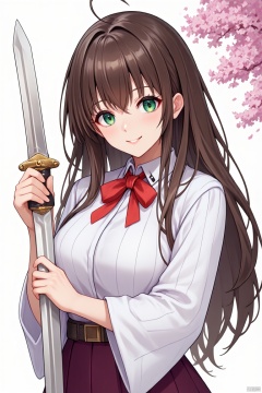 A girl with long dark brown hair, wearing a white kimono, adorned with a brown belt and a red bow. She is holding a sword in her right hand, with her left hand resting on the handle of the sword. Her eyes are a piercing blue, adding a pop of color to the scene. The background is blurred, revealing a tree with pink flowers.