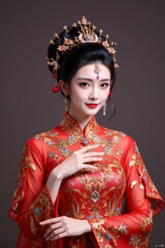 A woman adorned in an elaborate traditional Chinese outfit. She wears a striking red dress with intricate golden embroidery featuring floral patterns. Her hair is styled in a classic Chinese manner,secured with ornate accessories that include jeweled pins and combs. The woman's makeup is reminiscent of ancient Chinese beauty standards,characterized by vibrant red lips and subtle eye shadow. She poses gracefully,her hand lightly touching her chest,conveying a sense of serenity and elegance.,
