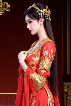 A woman adorned in an elaborate traditional Chinese outfit. She wears a striking red dress with intricate golden embroidery featuring floral patterns. Her hair is styled in a classic Chinese manner,secured with ornate accessories that include jeweled pins and combs. The woman's makeup is reminiscent of ancient Chinese beauty standards,characterized by vibrant red lips and subtle eye shadow. She poses gracefully,her hand lightly touching her chest,conveying a sense of serenity and elegance.,