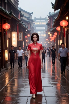 A scene full of Eastern style,featuring a young woman in a red qipao at the center. Her hairstyle is short and neat,and her face is calm. She stands on a wet stone path,with ancient buildings on both sides decorated with red lanterns and signs. The style of these buildings suggests that this may be a historic district. It is raining in the sky,and raindrops are falling,creating a hazy beauty. Behind the woman is a busy street,with people walking and chatting,some busy with their activities. The lights on the street and the rain reflect each other,giving a sense of tranquility and liveliness.,