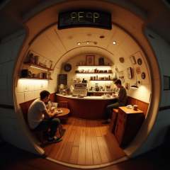 cinematic film still professional 3d model <lora:lora-2..000008.TA_trained:1>A circular, tunnel-like café diorama with a barista behind a curved counter, making coffee. The rounded walls feature shelves with cups and coffee jars, while a small menu board is visible. A customer sits at a tiny table enjoying their drink. Soft, cozy lighting fills the space, and the fisheye perspective draws the viewer into this intimate café moment. . octane render, highly detailed, volumetric, dramatic lighting . shallow depth of field, vignette, highly detailed, high budget, bokeh, cinemascope, moody, epic, gorgeous, film grain, grainy
