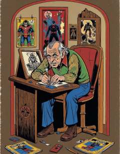 st3v3n_r0hod3s an old comic book artist hunched over his drawing desk his face lined with exhaustion his hands overly large and veiny the room is filled with comic book pages scattered across the floor old posters line the walls and the dim light gives the entire scene a melancholic feel