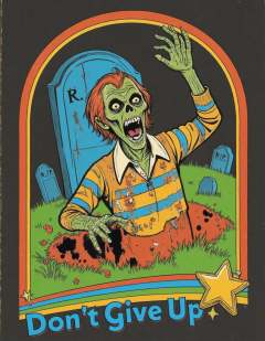 Retro-styled zombie rising from the grave in a vibrant cartoonish aesthetic. The zombie has a skeletal face with patches of decaying flesh, hollow eyes, and a wide, ghastly grin. It is wearing a torn yellow and blue striped shirt, revealing decayed skin and bones underneath. One hand reaches upward, while the other breaks through the dirt. The background features a graveyard with a large, cracked gravestone marked 'R.I.P.' and other smaller tombstones in the distance. Bright green grass contrasts with the dark tones of the graveyard. At the bottom, a colorful vintage banner arcs across the frame, with the bold, bubble-like text 'Don't Give Up' in blue letters outlined in white. A large yellow star and sparkles adorn the banner. The overall vibe is a mix of horror and humor, with a playful, retro 70s-80s feel, and a bright, contrasting color palette. st3v3n_r0hod3s