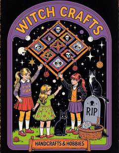 Retro-styled cartoon featuring three young girls engaging in witch-themed crafts. The scene is playful and whimsical, with the girls raising their hands in excitement as they admire a large patchwork quilt floating above them. The quilt features colorful squares, each adorned with witchy symbols like skulls, pentagrams, and moons in shades of purple, orange, red, and green. One girl, with blonde hair in pigtails, wears a purple and white shirt with a red skirt. Another girl has purple hair in pigtails, wearing a green dress with a dotted pattern, while the third girl has long red hair, wearing a black jacket over a purple skirt. They are surrounded by balls of yarn and knitting tools floating in the air, adding to the crafting theme.Behind them, a gravestone marked 'R I P' is nestled in the ground next to a skull, while a basket full of yarn and crafting supplies sits in front of it. A black cat, wrapped in red yarn, is sitting on the right side of the image. The background is framed with a light purple border, filled with sparkles and stars, adding a magical atmosphere to the scene.At the top, the bold text 'Witch Crafts' is written in a large, playful, bubble-like font with a purple outline. Below the scene, the text 'Handcrafts & Hobbies' is written in a smaller font, grounding the theme in a humorous take on crafting with a witchy twist. The overall color palette is bright and retro, featuring purples, greens, oranges, and blacks, creating a fun, lighthearted, and magical vibe. st3v3n_r0hod3s
