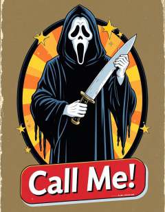 The image is a vibrant and stylized illustration of a character from the horror movie 'Scream'. The central figure, Ghostface, dressed in black robe, holding a large knife  and a phone. A bold red sticker at the bottom proclaims "Call Me!" in white text, emphasizing the character's connection to the film's themes of revenge and psychological manipulation  st3v3n_r0hod3s