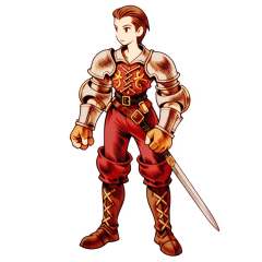 a fftstyle illustration of a young man in a medieval-style outfit. He is standing with his body slightly turned to the side, with his left hand on his hip and his right hand holding a sword. The outfit is made up of a red and gold armor with intricate patterns and designs. The man has short brown hair and is wearing a pair of brown boots. He has a serious expression on his face and is looking off to the left. The background is white., solo, short hair, simple background, brown hair, white background, closed mouth, brown eyes, standing, full body, male focus, weapon, boots, belt, sword, armor, looking to the side, shoulder armor, clenched hand, gauntlets, sheath, buckle, clenched hands, legs apart, pauldrons, sheathed, cross-laced clothes, armored boots, looking afar, red pants, hair slicked back, greaves, knight
