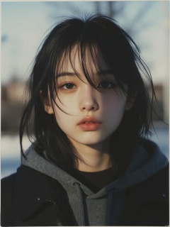 OBbllai, A close-up portrait of a young Asian girl with dark brown eyes and dark brown hair. She is wearing a black jacket with a gray hoodie over it. Her hair is pulled back and cascades over her shoulders. The backdrop is blurred