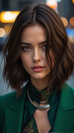 Depict a close-up of a beautiful city woman with flawless, radiant skin and striking features. Her eyes are captivating, framed by long lashes, and her lips are painted a bold, modern shade. Her sleek, shoulder-length hair is styled in a chic bob, adding to her fashionable appearance. She wears a cutting-edge, high-fashion ensemble—a tailored, asymmetrical blazer in a deep emerald green with bold metallic accents, paired with a statement necklace that gleams in the soft city light. The texture and fabric of her outfit exude luxury, perfectly complementing her confident, poised expression. In the background, blurred city lights twinkle, emphasizing her place as a trendsetter in the urban landscape.