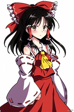 simple background,hakurei reimu,1girl,hair bow,red bow,detached sleeves,solo,hair tubes,simple background,looking at viewer,frilled bow,red skirt,sidelocks,wide sleeves,bare shoulders,blush,yellow ascot,ribbon-trimmed sleeves,hakurei_reimu,hair_bow,red_bow,blackeyes,cute