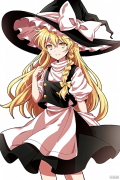 simple background,kirisame_marisa,witch_hat,kirisame_marisa,hat,blonde_hair,solo,braid,yellow_eyes,long_hair,witch_hat,single_braid,white_bow,hair_bow,black_skirt,