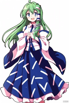 simple background,kochiya sanae,1girl,solo,frog hair ornament,snake hair ornament,hair tubes,detached sleeves,open mouth,looking at viewer,wide sleeves,blush,white shirt,blue skirt,kochiya_sanae,frog_hair_ornam