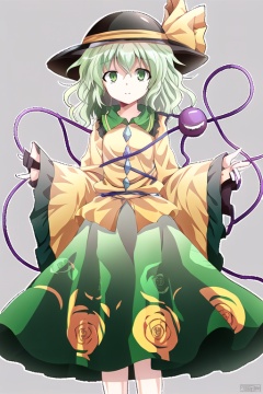 ,simple background,komeiji koishi,1girl, hat,hat bow,green hair,green eyes,yellow shirt,green skirt,,long sleeves, wide sleeves, floral print,third eye,eyeball,cute