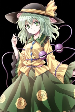 ,simple background,komeiji koishi,1girl, hat,hat bow,green hair,green eyes,yellow shirt,green skirt,,long sleeves, wide sleeves, floral print,third eye,eyeball,cute