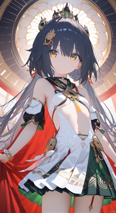 (score_9,score_8_up,score_7_up), (masterpiece),( beautiful),(high quality),(finely detailed),extremely detailed CG unity 8k wallpaper,best quality, 1girl, solo, long hair, breasts, looking at viewer, blush, bangs, skirt, hair ornament, navel, holding, hair between eyes, bare shoulders, twintails, jewelry, very long hair, closed mouth, blue hair, yellow eyes, cowboy shot, small breasts, sleeveless, choker, armpits, green skirt, white skirt, detached sleeves, navel, black hair, red cape, yunliSR