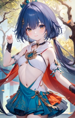 (score_9,score_8_up,score_7_up), (masterpiece),( beautiful),(high quality),(finely detailed),extremely detailed CG unity 8k wallpaper,best quality, 1girl, solo, long hair, breasts, looking at viewer, blush, bangs, skirt, hair ornament, navel, holding, hair between eyes, bare shoulders, twintails, jewelry, very long hair, closed mouth, blue hair, yellow eyes, cowboy shot, small breasts, sleeveless, choker, armpits, green skirt, white skirt, detached sleeves, black hair, red cape, yunliSR,smile